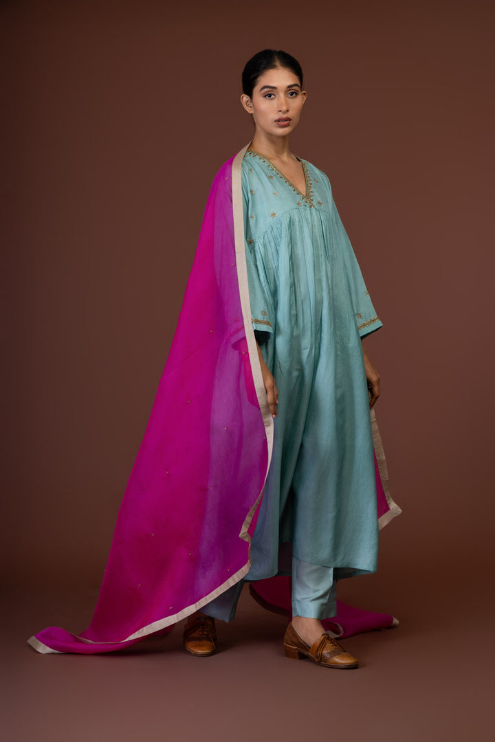 تم تصميم الكورتا المتراكبة المصنوعة من حرير التوت المنسوج يدويًا بزخارف موكايش متناثرة وطباعة باندهيني هندسية موضوعة بعناية. تم تصميم هذه السترة لتنسدل بشكل فضفاض على الجسم ويتم تنسيقها مع بنطالنا الكلاسيكي المستقيم بطول الكاحل. لا أكثر ولا أقل، والأهم من ذلك، احتفالية ممتعة خالية من الضجة.