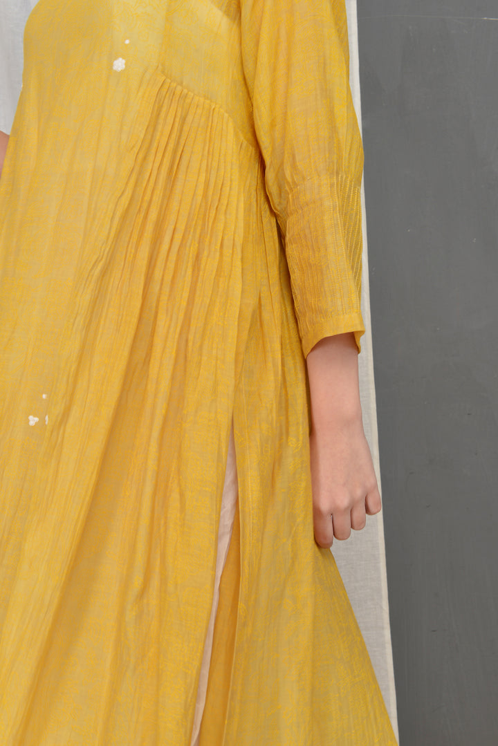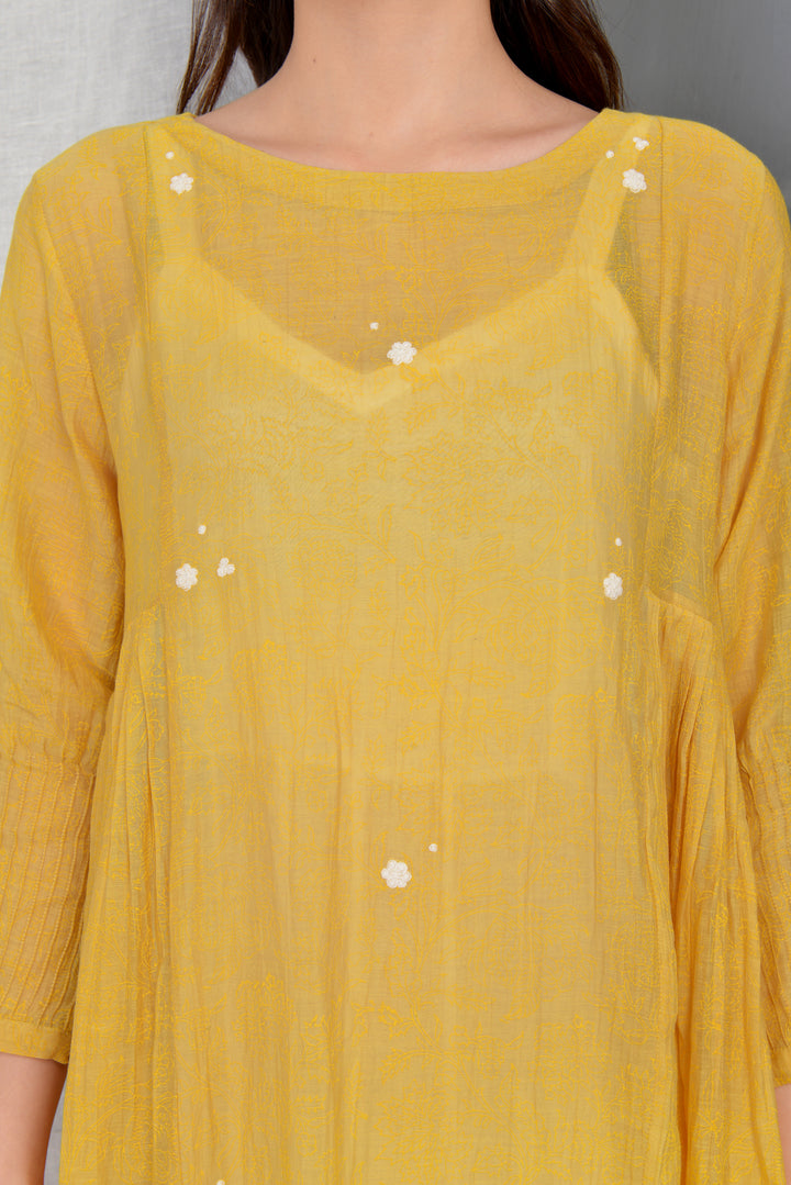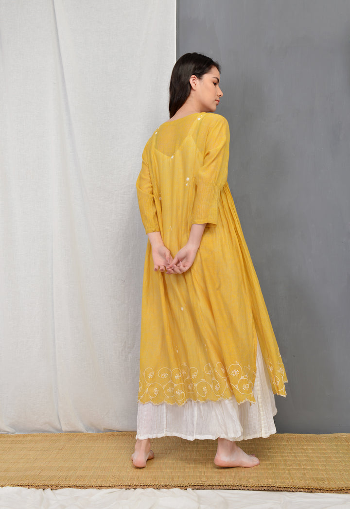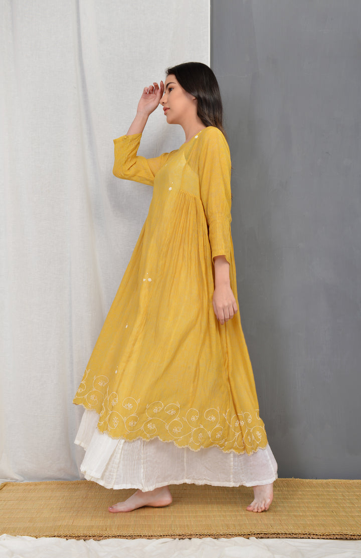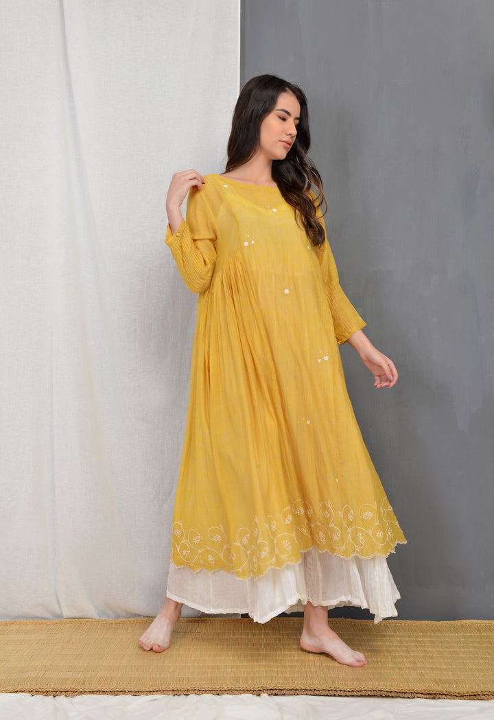 الفستان مصنوع من حرير شانديري الفاخر ومزين بتطريزات زهرية دقيقة وتفاصيل على شكل دبوس. يحتوي الفستان على طيات على الألواح الجانبية وتفاصيل صدفية على الحاشية. يأتي الفستان بسحاب داخلي وهو إضافة مثالية لخزانة ملابسك الصيفية.