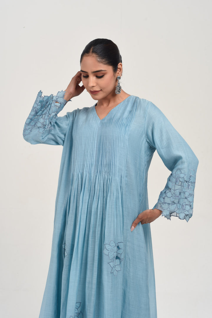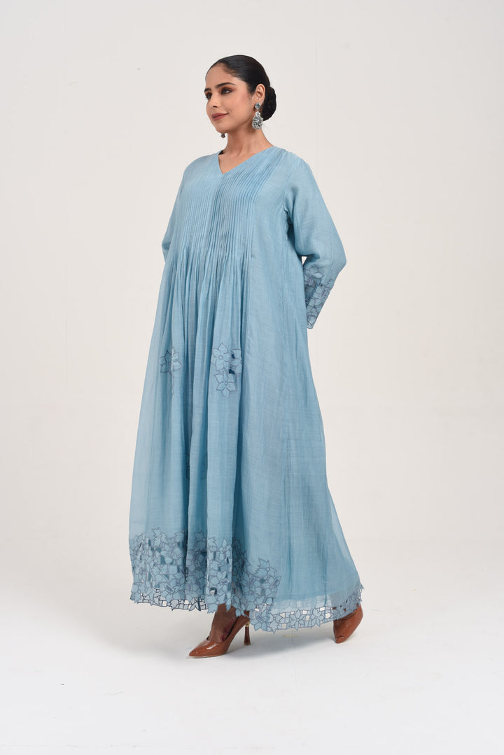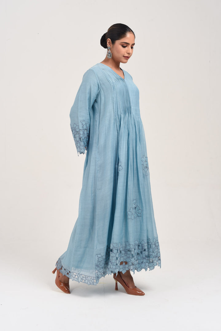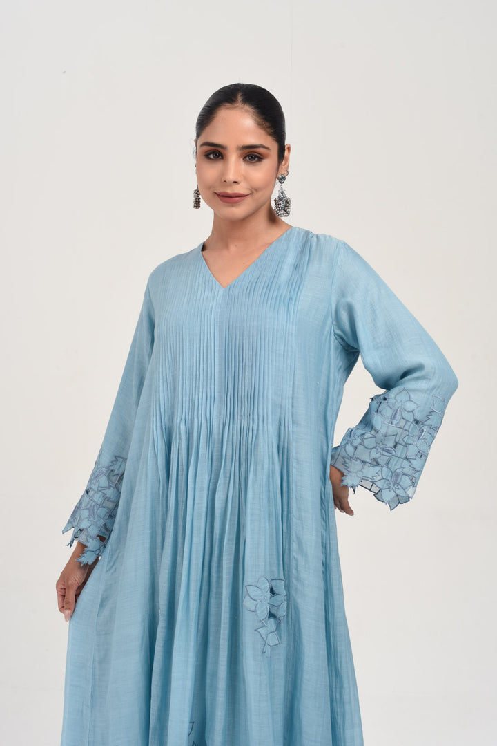 Crafted in handwoven chanderi, the pleated double layered dress features floral impressionist appliqué embroidery on the panels.