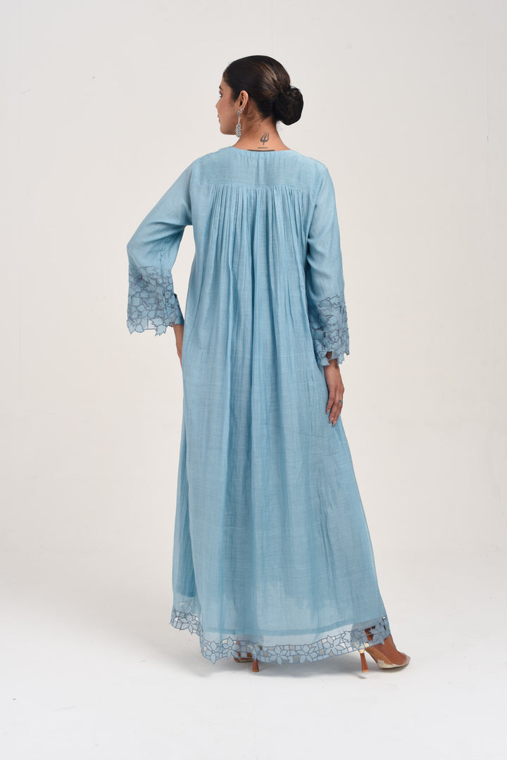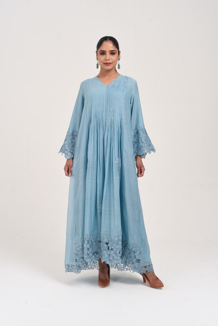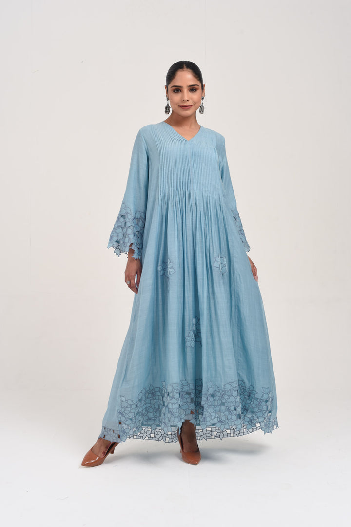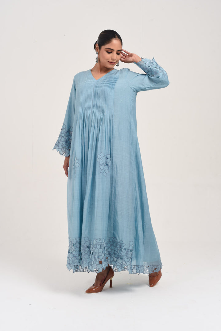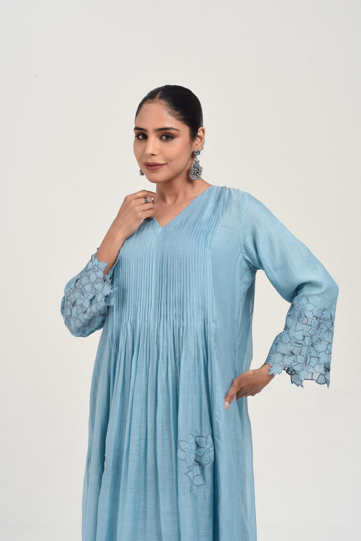 Crafted in handwoven chanderi, the pleated double layered dress features floral impressionist appliqué embroidery on the panels.
