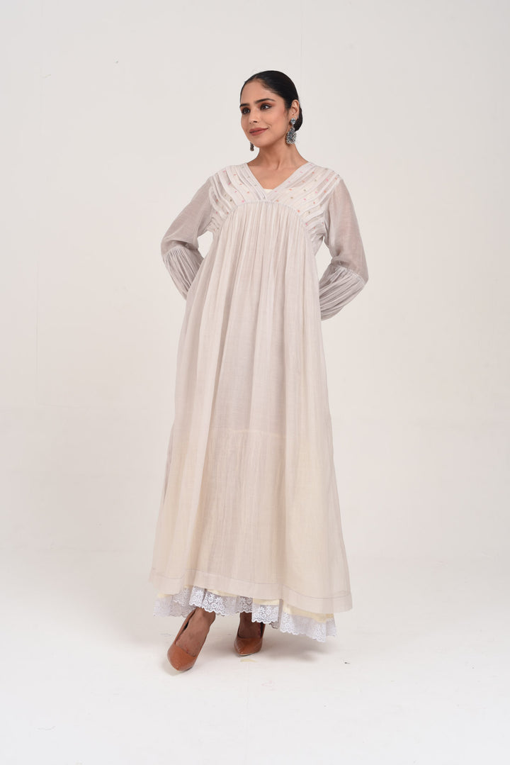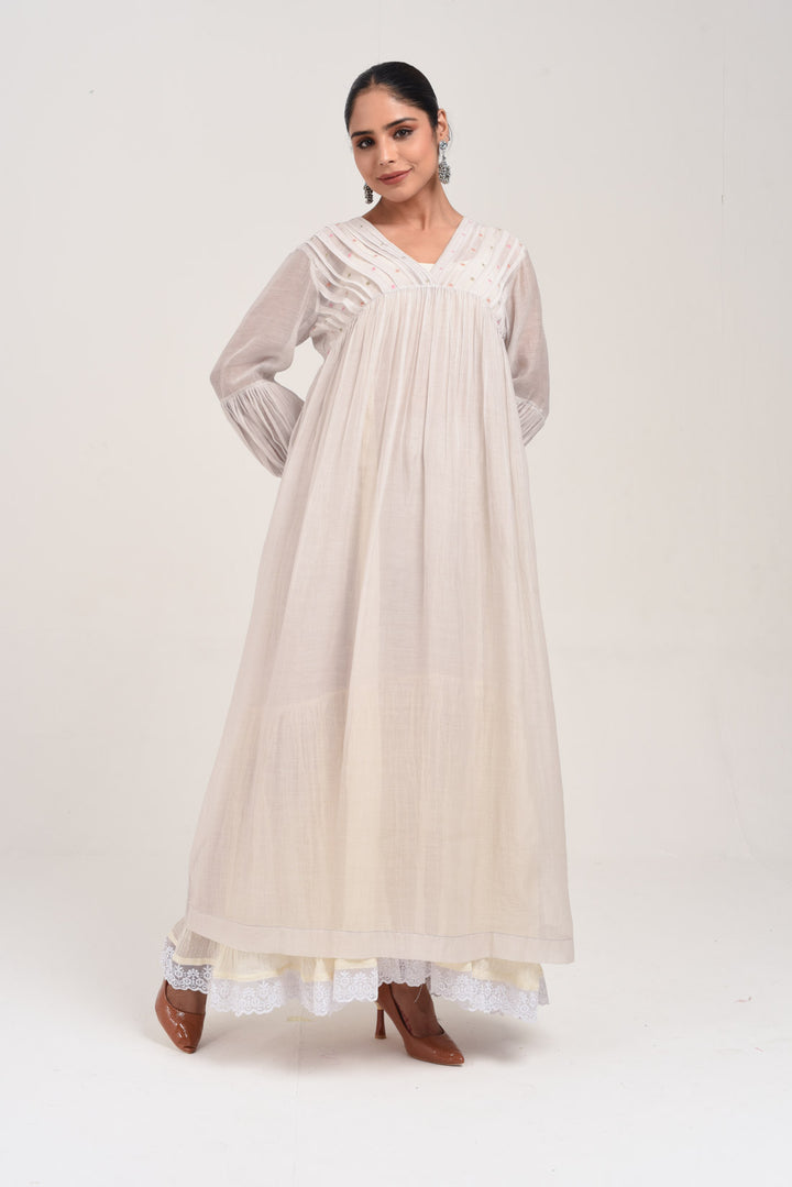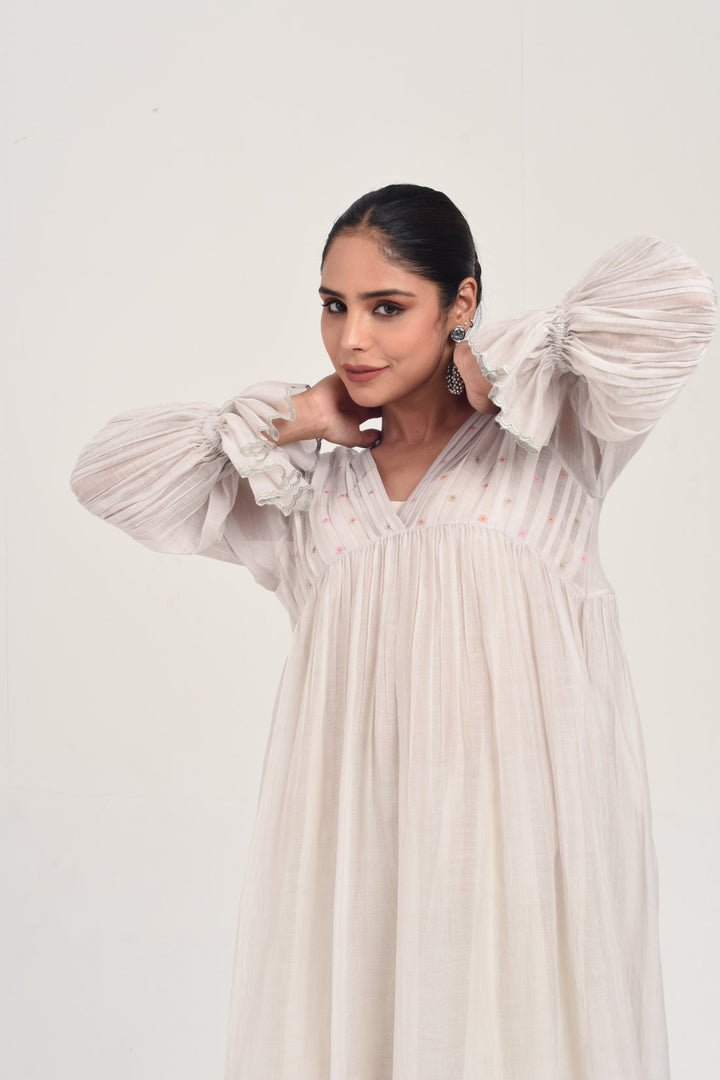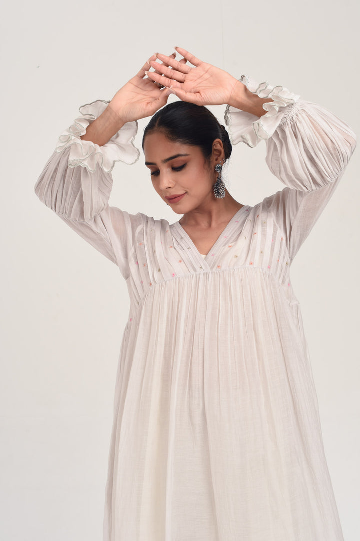 Crafted in handwoven chanderi, the pleated dress features impressionist floral embroidery and print on the panels.  It is paired with an inner slip.