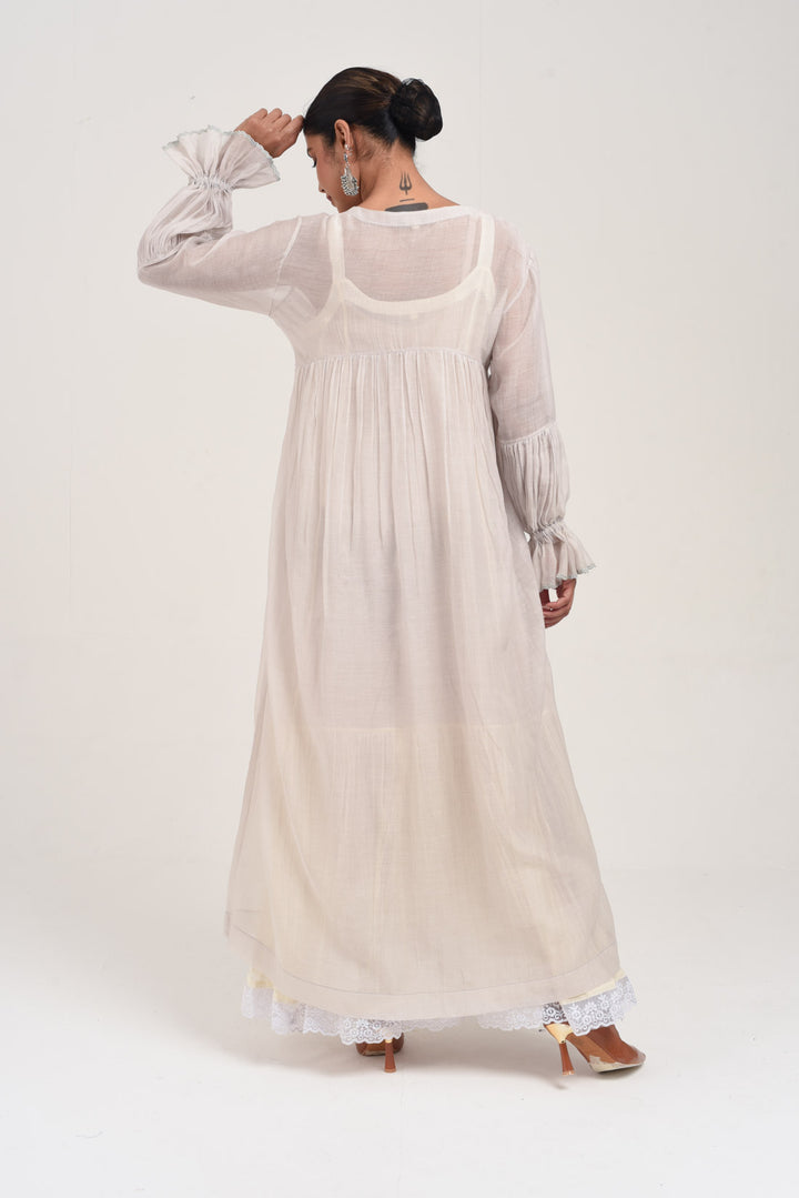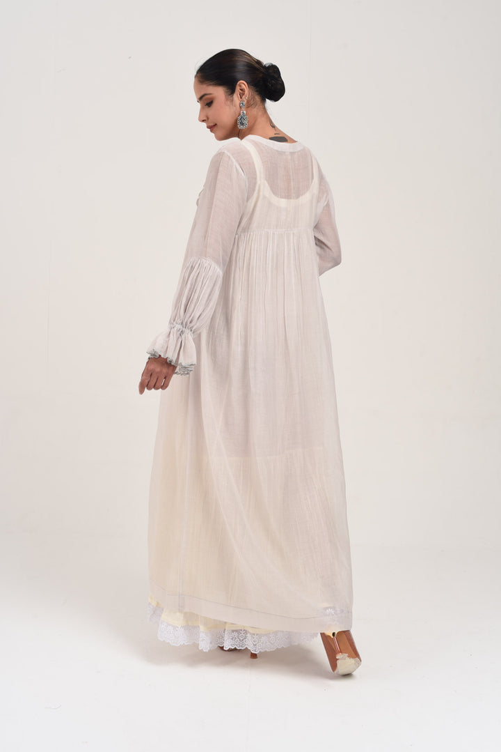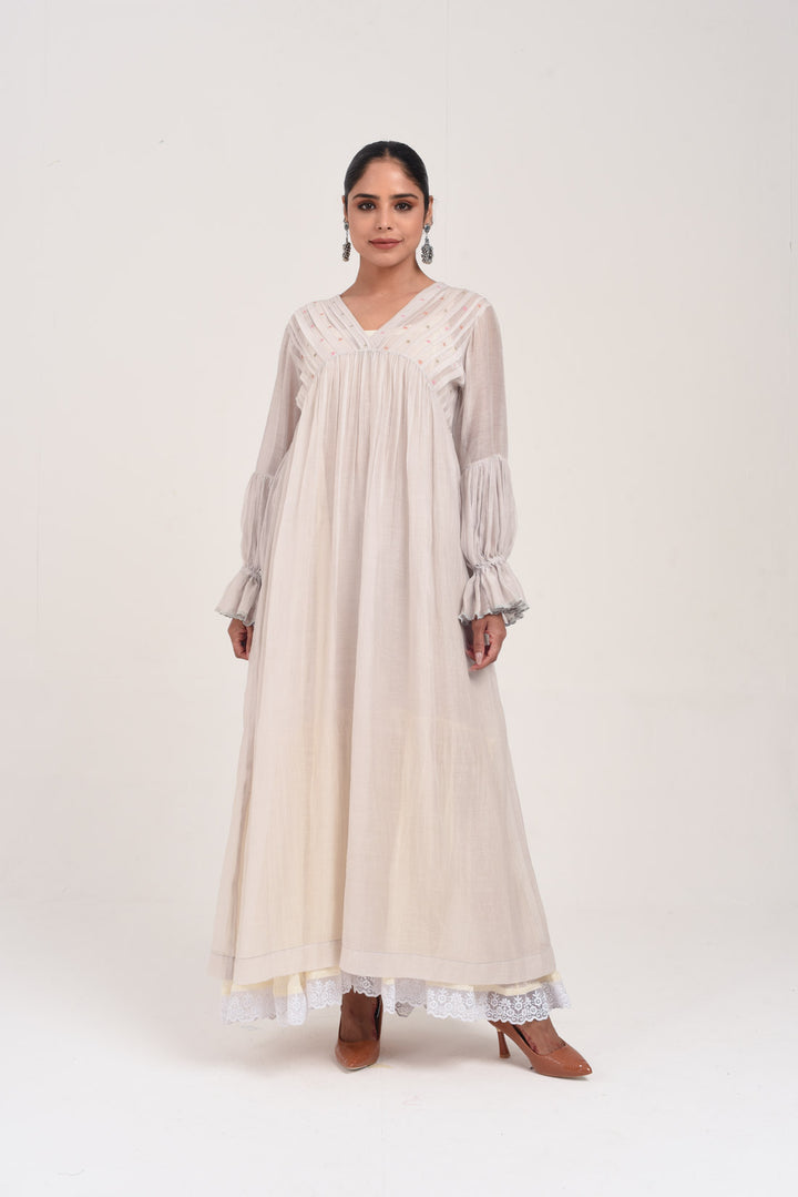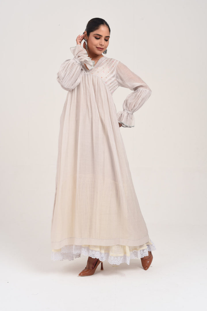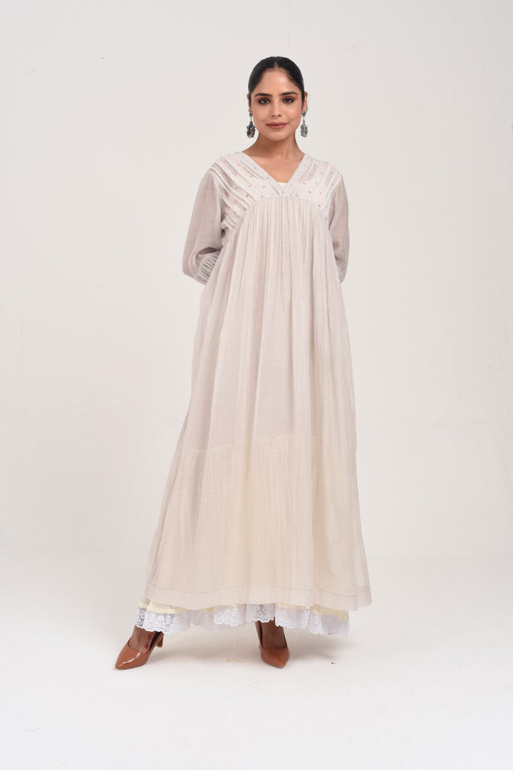 Crafted in handwoven chanderi, the pleated dress features impressionist floral embroidery and print on the panels.  It is paired with an inner slip.