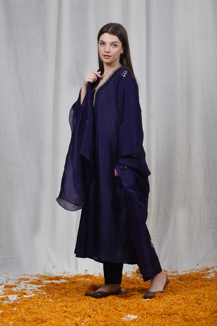 Crafted in handwoven mulberry , the set features delicate kolam inspired dabka and metal tikki embroidery on the tunic and dupatta. It comes with our classic straight cut lower