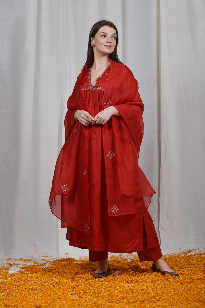 Crafted in handwoven mulberry , the set features delicate kolam inspired dabka and metal tikki embroidery on the tunic and dupatta. It comes with our classic straight cut lower