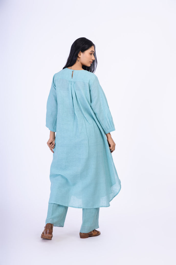 Crafted in handwoven linen, the set features impressionist floral hand embroidered highlights on the panels. The tunic is paired with our classic straight cut lower.