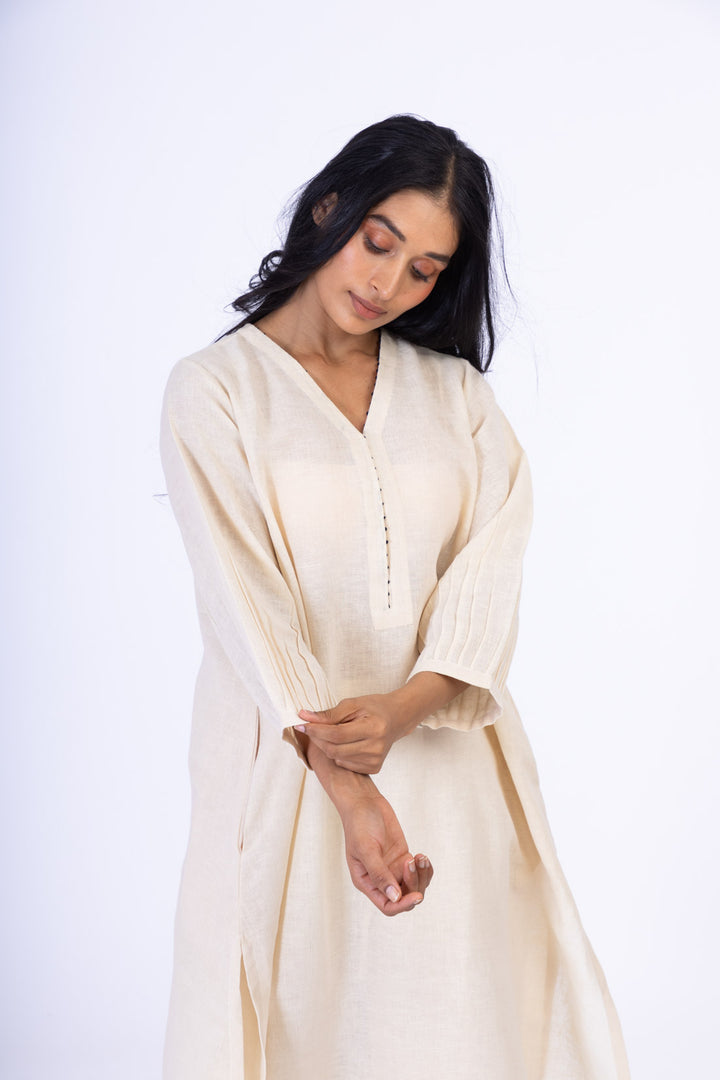 Crafted in handwoven linen, the set features contrast knot highlights on the panels. The tunic is paired with our classic straight cut lower.