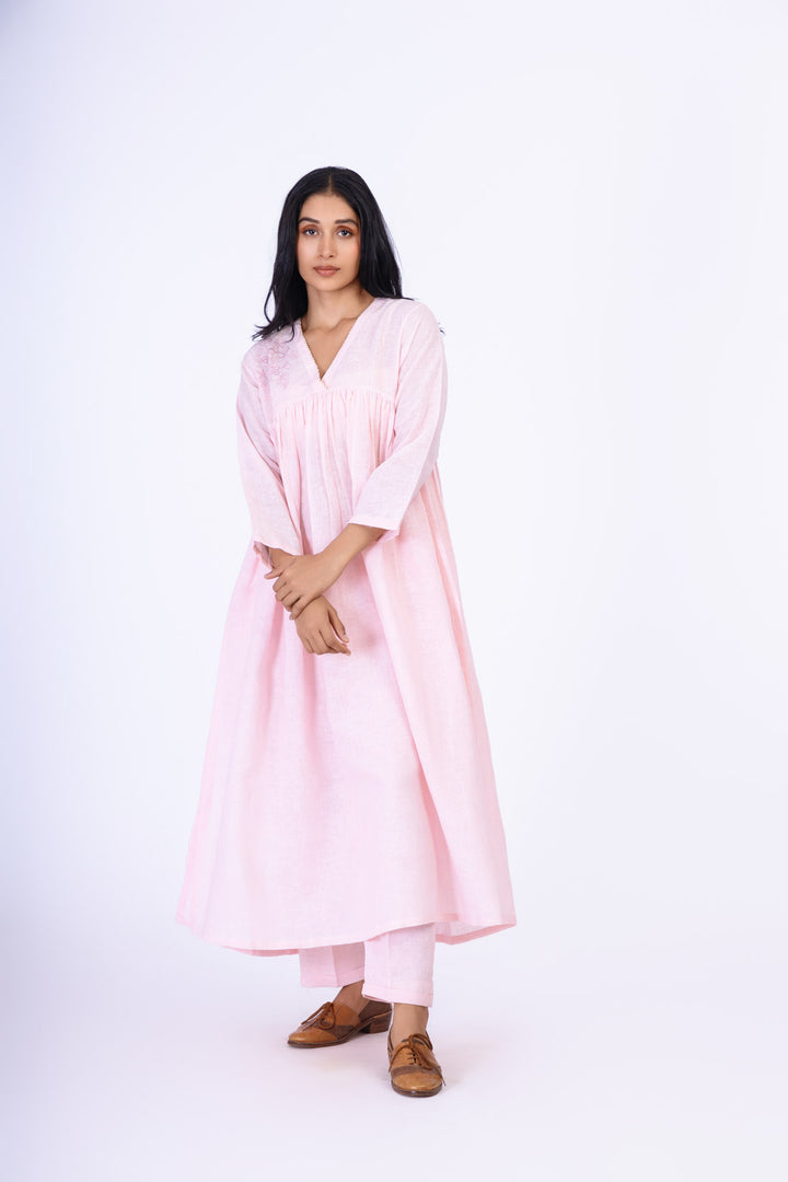 Crafted in handwoven linen, the set features impressionist floral hand embroidered highlights on the panels. The tunic is paired with our classic straight cut lower.