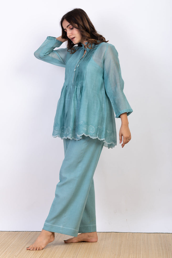 Crafted in handwoven chanderi silk, the set features impressionist floral hand embroidered highlights on the panels. The tunic is paired with our classic straight cut lower.