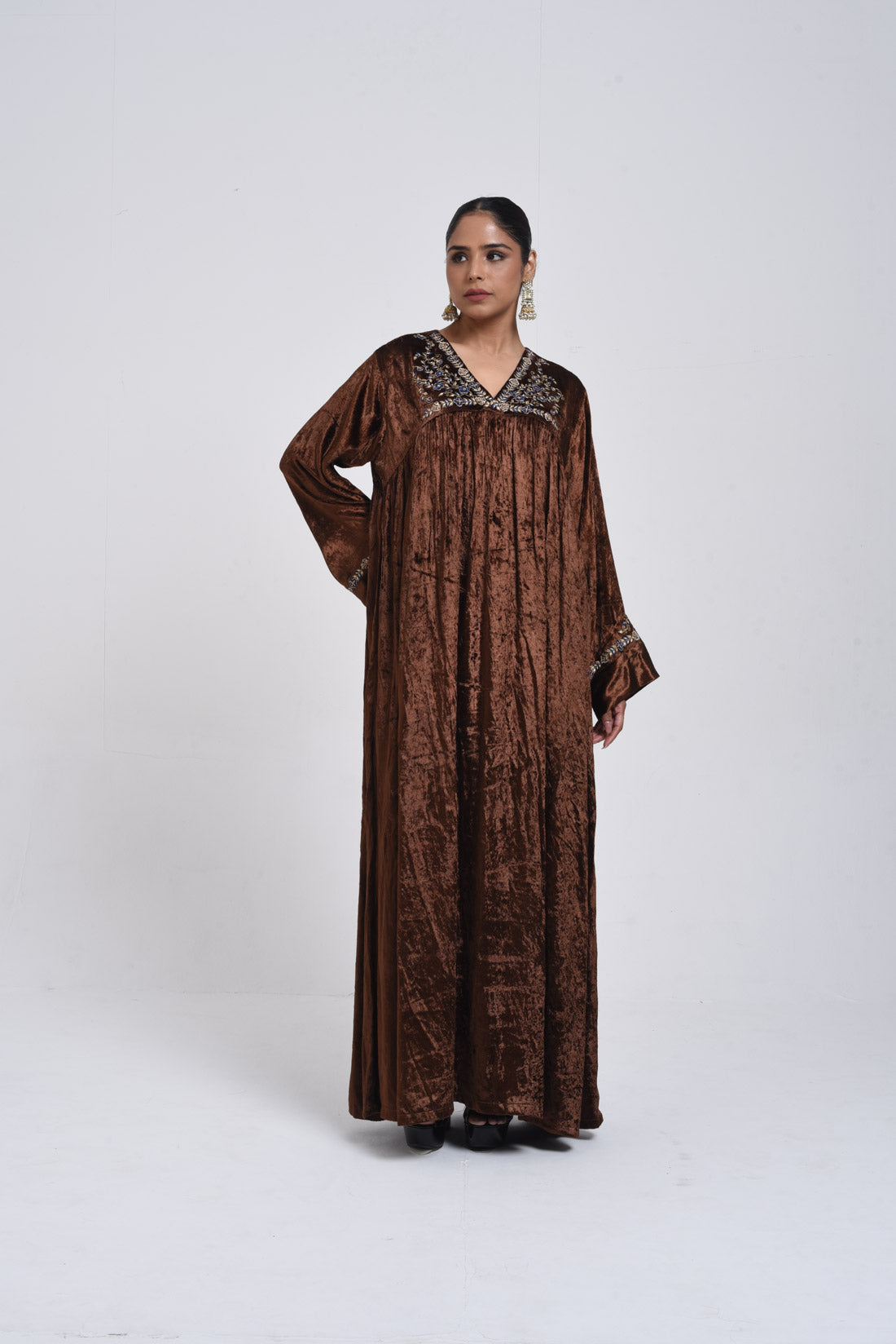 Gathered dress with side-pockets and a short yoke detail, crafted in luxurious silk velvet. It features panels enhanced with the earthy embroidery stitches; embroidered mughal motifs rendered using thread textures, sequins and dabka on the sleeve hem; and the neckline is defined with similar intricate embroidery and resham thread work.