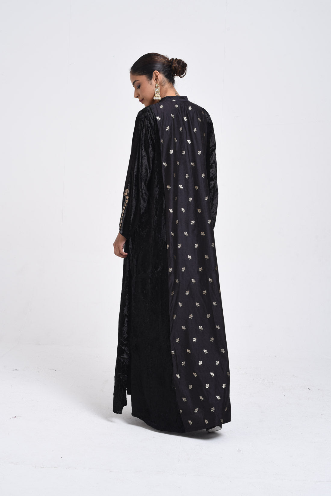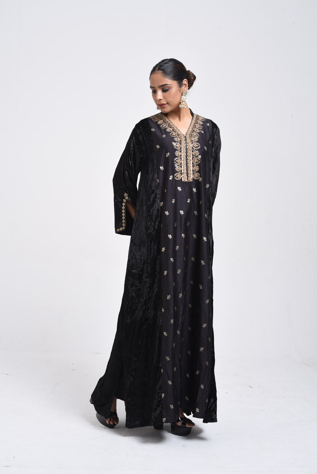 Panelled phiran with side-pockets crafted in luxurious silk velvet and handwoven silk. It features panels enhanced with embroidered mughal motifs rendered using textures of beads, sequins and dabka on the neckline,  and details of woven silk with similar weave on the sleeve hem.