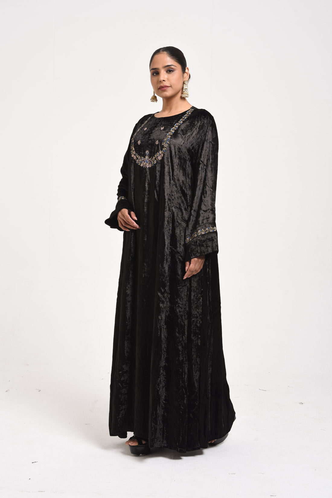 Panelled phiran dress with side-pockets crafted in luxurious silk velvet. It features yoke enhanced with embroidered mughal motifs rendered using textures of thread work, beads, sequins and dabka on the neckline and similar work on the sleeve hem.
