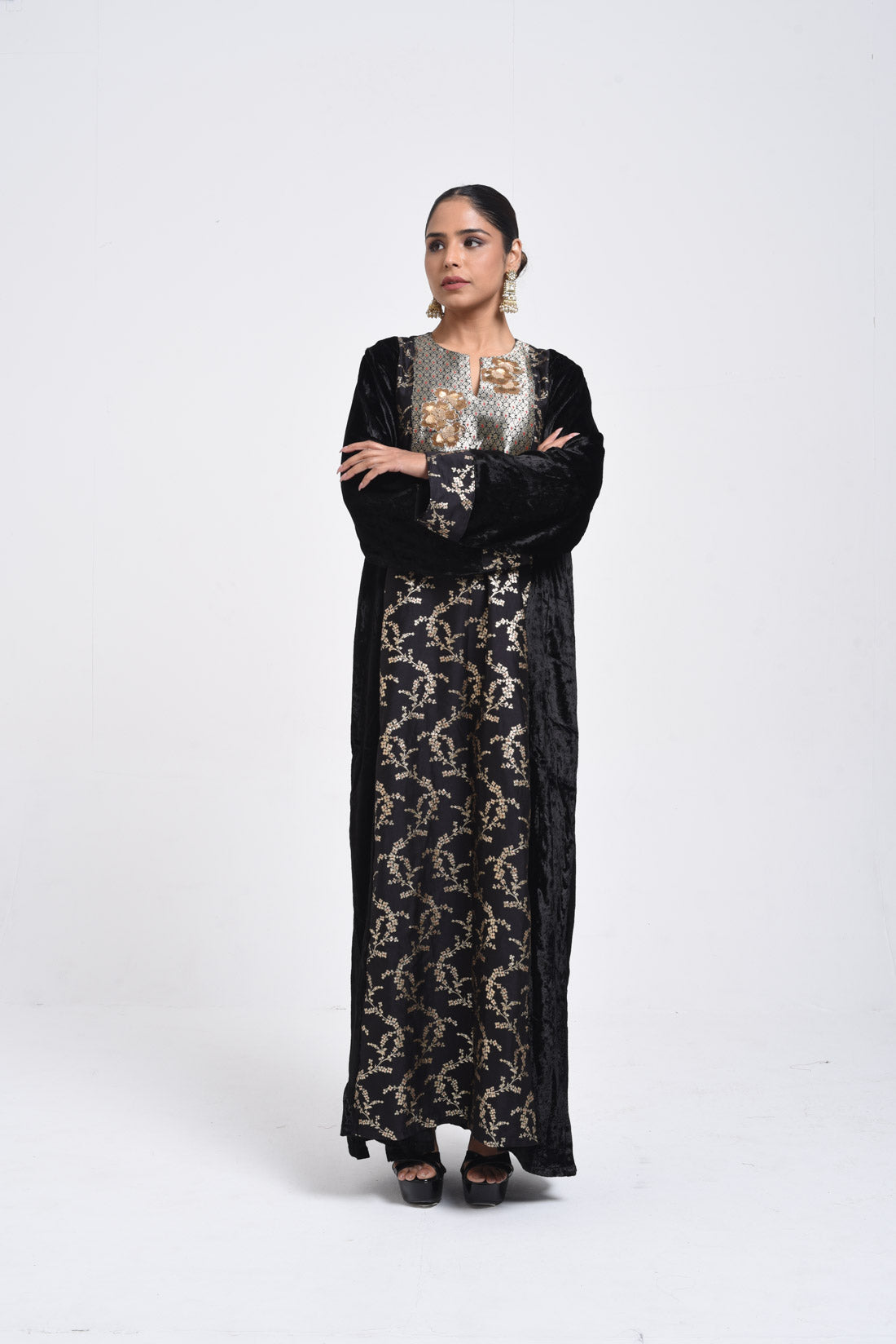 Panelled phiran with side-pockets and a short yoke detail, crafted in luxurious silk velvet and handwoven silk. It features panels enhanced with embroidered mughal motifs rendered using textures of beads, sequins and dabka on the neckline, and details of woven silk with similar weave on the sleeve hem..