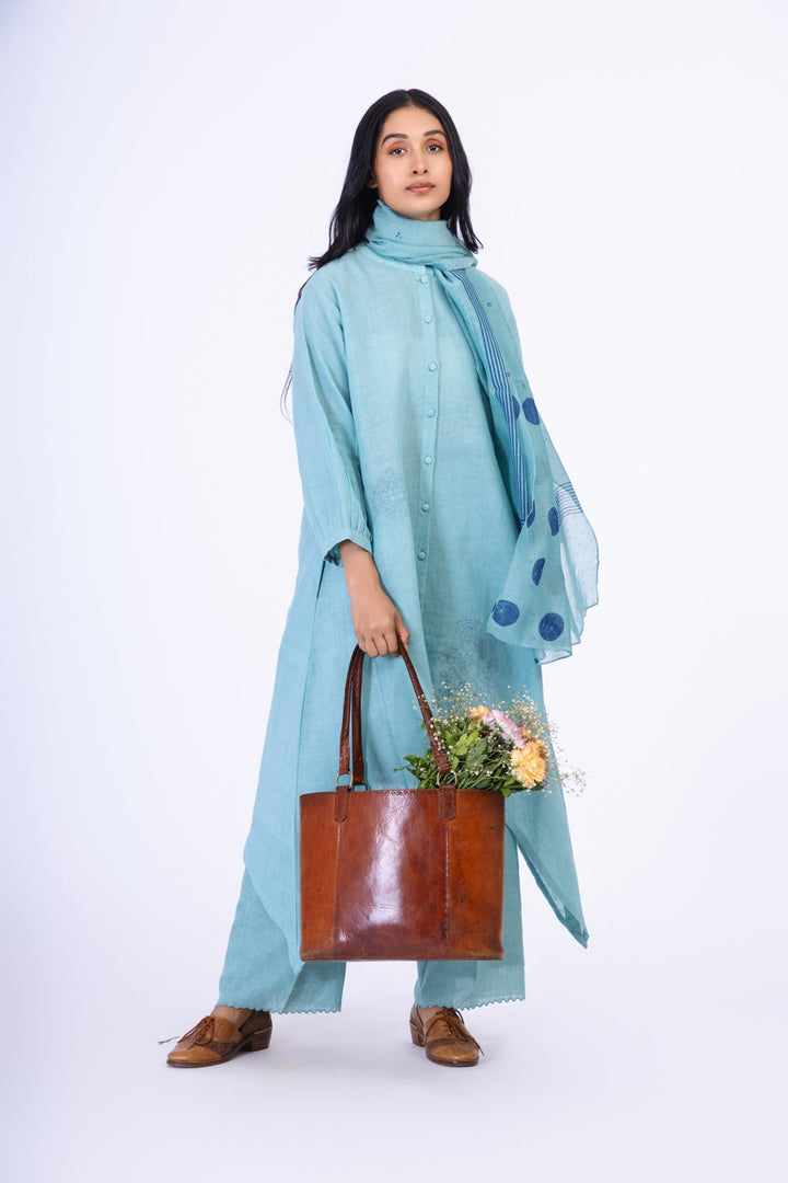 Crafted in handwoven linen, the set features contrast knot highlights on the panels. The tunic is paired with our classic straight cut lower.