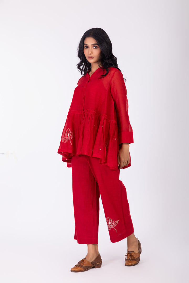 Crafted in handwoven chanderi, the tiered tunic features impressionist floral hand embroidered highlights on the panels. It comes with an inner sli and our classic straight cut lower.