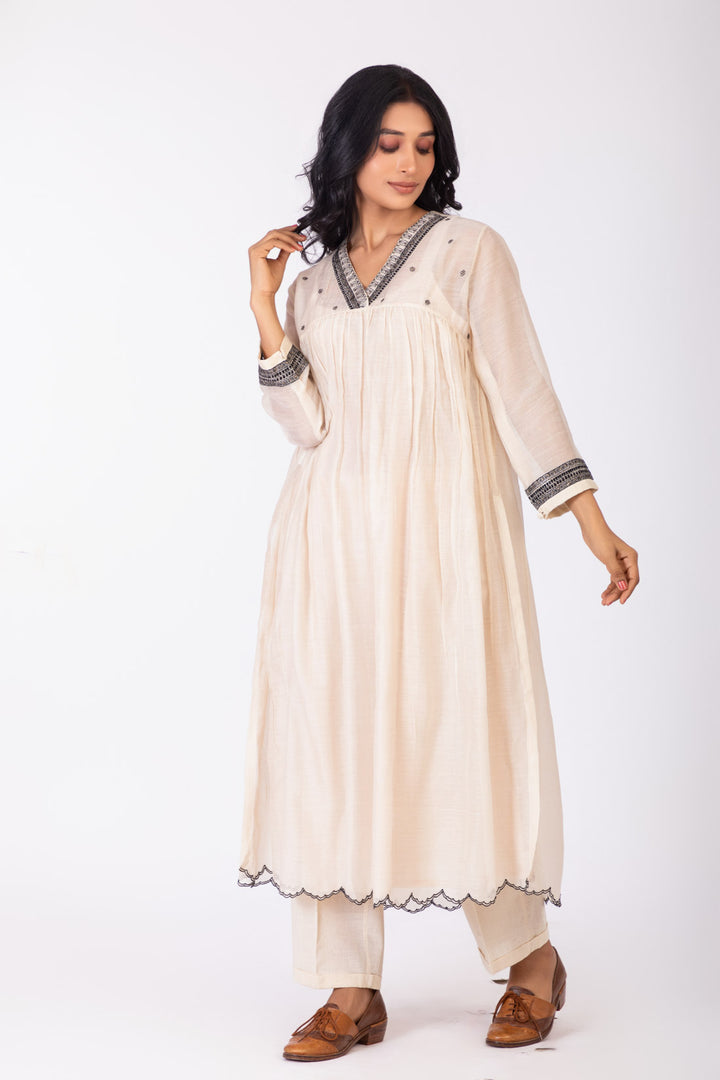 Crafted in handwoven chanderi, the tunic set features impressionist floral embroidery on the panels. It is paired with a lower and dupatta in chanderi silk.
